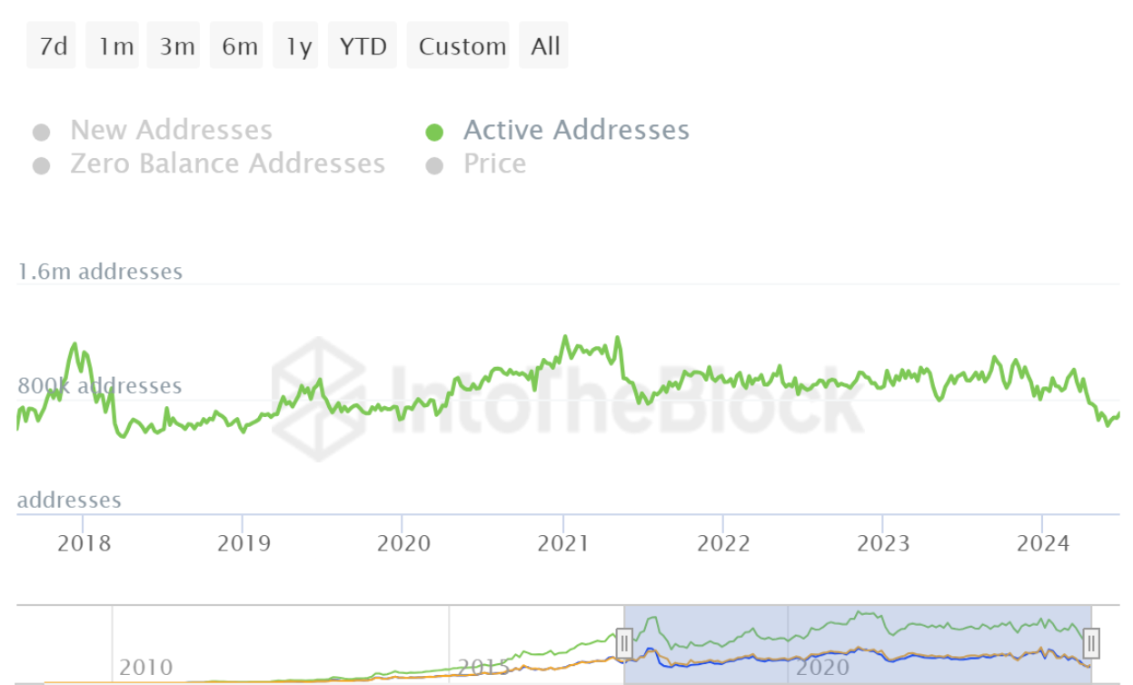 La actividad en la red de Bitcoin ha caído a su nivel más bajo desde 2010, lo que ha generado preocupaciones sobre la falta de participación minorista en el mercado de criptomonedas más establecidas. Según datos on-chain de IntoTheBlock, la proporción de direcciones activas de Bitcoin ha disminuido significativamente, registrando mínimos que no se veían desde noviembre de 2010.